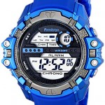 Features buckle closure, day, date, and seconds displays, and chronograph with alarm, lap time, dual time, military time, and backlight functions