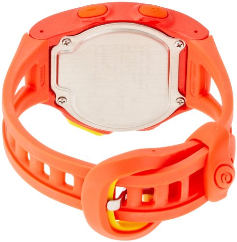 Orange plastic case with a orange polyurethane bracelet. Fixed bezel. with Arabic numeral hour markers. Dial Type: digital. Quartz movement. Scratch resistant mineral crystal. Pull / push crown. Plastic screw-down case back. Case diameter: 39 mm. Case thickness: 10 mm. Oval case shape. Band width: 21 mm. Band length: 7.5 inches. Tang clasp. Water resistant at 50 meters / 165 feet. Functions: chronograph, day, date, hour, minute, second. Additional Info: data (recall / memo input available); timer (double repeat timer); alarm (3-channel daily alarm); backlight; power saving function; display adjustment. Sport watch style. Asics Orange Plastic Race Chronograph Running Watch CQAR0107.