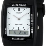 This sleek and sophisticated casual watch from Casio’s Classic series is a stylish analog watch with convenient digital functions for the best of both worlds. The square white dial features silver-toned hands and gray dash indexes, while the white-background digital window below conveniently displays a second time or calendar date. The rectangular case is made of stainless steel, and the bezel and watch band are made of a rugged, black polyurethane resin for a futuristic appeal. The analog quartz watch also offers a daily alarm, hourly time signals, and 1/100 second stopwatch capabilities. The timepiece is water resistance up to 99 feet.