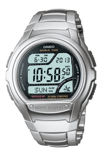 This Casio waveceptor sport watch is a stylish casual watch bursting with features, making it an ideal choice for world travel or everyday adventures. The distinctive digital display features four asymmetrically divided mini-windows inside the round, brushed stainless steel bezel. The central window shows the time, kept accurate with multi-band atomic timekeeping and world time settings for up to 29 time zones (48 cities). The upper window displays the month and date, and the lower two windows display the day of the week and the waveceptor receiving signal. This watch also offers a daily alarm, countdown timer, 1/100 second stopwatch and an EL backlight with afterglow. The elegant stainless steel band with fold-over clasp and double push-button safety release completes the look. This watch is water resistant up to 165 feet (50 meters) and offers a two-year battery life.