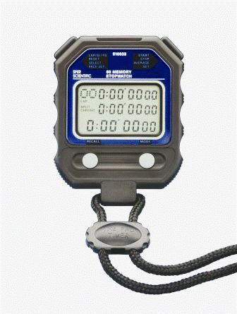 Two 1/100th second displays. Counts up or down to 10 hours. Ideal for multiple and simultaneous processes. In stopwatch mode current lap time shown in upper display, cumulative total in lower one. Memory stores last 60 lap times so there is no need to look away from a test to make notes. It shows fastest, slowest, and average lap times, alarm clock function. In timer mode upper display shows original setting while lower one counts down. Countdown cycles repeat upon completion. 30 second shuttle timer for use during timeouts. Lap counter shows number of laps (up to 99) in stopwatch mode and number of cycles repeated in timer mode. Pacesetter function can be set to beep continually from 10 beeps per minute to 320 beeps per minute. Shock resistant, superb hand grip. Water resistant. N.I.S.T. traceable certificate of compliance available