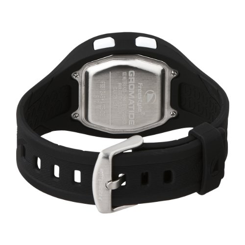 Built with the surfer in mind, the Freestyle Midsize Gromatide Watch boasts tide data for 75 beaches, with an 180-minute offset and programmability for nine of your favorite locations. Simple, stylish, and made to handle the elements, this all-black timepiece is crafted with a durable plastic case, stainless steel bezel, and polyurethane strap with adjustable buckle. The digital dial displays dual time and day and date calendars. Featuring quartz movement, this Freestyle men’s watch is water resistant to 330 feet (100 m).