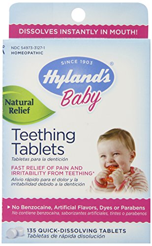 Hyland’s baby teething tablets are all natural, homeopathic formula. Releives symptoms of teething pain and irritability. Soft Tablets dissolve instantly. No artificial flavors, dyes or parabens.