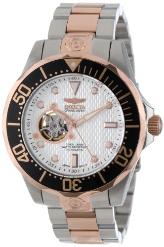 Stainless steel case with a two-tone (silver and rose gold ion-plated) stainle bracelet. Uni-directional rotating rose gold ion-plated bezel with a black topring. Black with skeletal display dial with luminous rose gold-tone hands and dot hour markers. Minute markers around the outer rim. Dial Type: Analog. Luminescent hands and markers. Automatic movement. Japanese nh38a automatic w/ 24 jewels engine. Scratch resistant flame fusion crystal. Screw down crown. Skeleton case back. Case diameter: 47 mm. Case thickness: 17 mm. Round case shape. Band width: 21 mm. Band length: 8.75 inches. Deployment clasp. Water resistant at 300 meters / 1000 feet. Functions: hour, minute, second. Casual watch style. Watch label: Japan Movt. Invicta Pro Grand Diver Automatic Mens Watch 13708.
