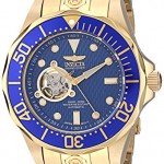 18kt gold ion-plated stainless steel case and bracelet. Uni-directional rotating 18kt gold ion-plated bezel with blue topring. Blue with skeletal display dial with luminous hands and dot hour markers. Minute markers around the outer rim. Dial Type: Analog. Japanese automatic movement. Scratch resistant flame fusion crystal. Screw down crown. Skeleton case back. Case diameter: 47 mm. Case thickness: 17 mm. Round case shape. Band width: 22 mm. Fold over clasp with safety release. Water resistant at 100 meters / 330 feet. Functions: hour, minute, second. Casual watch style. Invicta Grand Diver Automatic Blue Textured Dial 18kt Gold Ion-Plated Mens Watch 13711.