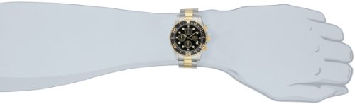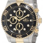 Stainless steel case with a two-tone (silver and gold-tone) stainless steel bracelet. Unidirectional black PVD bezel. Black dial with gold-tone hands and dot hour markers. Minute markers around the outer rim. Dial Type: Analog. Luminiscent hands and markers. Chronograph – three sub-dials displaying: 60 second, 60 minute and 1/10 of a second. Quartz movement. Scratch resistant flame fusion crystal. Solid case back. Case diameter: 44 mm. Case thickness: 12 mm. Fold over clasp with safety release. Water resistant at 200 meters / 660 feet. Functions: chronograph, hour, minute, second. Dress watch style. Invicta Pro Diver Chronograph Mens Watch 1772.