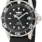 Elegance meets dependability and sport performance in Automatic Watch #9110 from the Invicta Men’s Pro Diver Collection. This timepiece features a black dial with a combination of dot, stick, and triangular indices, a convenient date display at three o’clock, and a trio of luminous hands, along with small stick indices marking each minute on an outer dial. Also showcasing a stainless steel unidirectional bezel with a black finish and bold indicators, including Arabic numerals at the 20, 30, 40, and 50 minute marks, this watch employs an antireflective mineral crystal to protect its face, and it utilizes Japanese automatic movement for extreme precision. It is held in place by a sleek, black rubber band with a buckle clasp, and it is water resistant to 660 feet for true dive functionality.