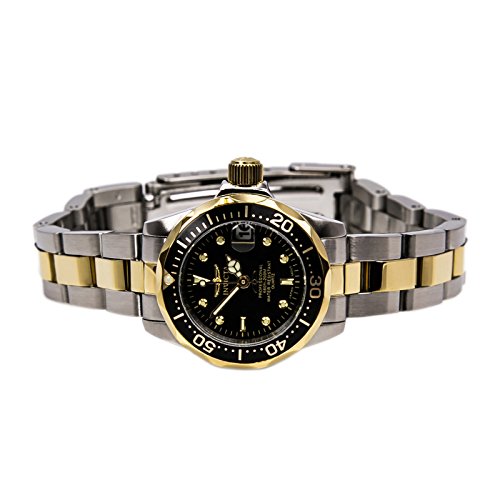Classically styled for the sporty lady, this two-tone, mid-sized Invicta stainless steel women’s watch travels easily between professional environs and weekend adventures. It features water resistance to 200 meters (660 feet), which is suitable for recreational diving, and a stylish, black unidirectional rotating bezel with gold engraved elapsed time markings. The black dial includes Tritnite luminous dotted markers and stylized hands (with seconds hand), small minute indexes, and a date window at 3 o’clock. Other features include a handsome stainless steel bracelet band with a fold-over safety clasp, anti-reflective mineral crystal, and Japanese quartz movement.