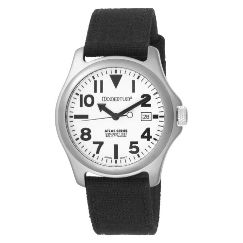 The ultimate understated sports watch, the Atlas is Momentum’s 21st-century take on the classic field watch. Designed for casual wear and everyday use, this bold, sturdy men’s watch features oversized black dial markings affixed to a luminous white dial, with a date calendar at the 3 o’clock position. The 41-millimeter case is a stylish solid titanium with a modern matte finish; it is perfectly complemented by a 20-millimeter, durable black Cordura band. The watch is equipped with a special screw-down, locking crown, and is waterproof tested to a depth of 330 feet (100 meters). An anti-reflective mineral crystal makes the watch easy to read. It is powered by Japanese-quartz movement.