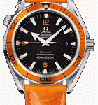 The Seamaster Planet Ocean from Omega delivers exceptional performance and great style, both above water and below. The polished steel case frames a black dial with luminous hour, minute, and seconds hands and luminous markers for excellent visibility, even in low light conditions. The dial also features orange Arabic numerals and a date display. The dial is capped with a virtually scratch-proof sapphire crystal and framed by a unidirectional rotating steel bezel, in orange, with minute markings and fluted edges for grip. An orange crocodile-textured leather strap completes the look. This Omega watch features self-winding Swiss automatic movement enhanced by Omega’s breakthrough co-axial escapement, a technology that ensures high precision and stable accuracy over long periods of use. It is rated water resistant to a full 600 meters (or 2000 feet).