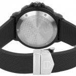 Black PVD stainless steel case with a black rubber bracelet. Unidirectional titanium-carbide coated bezel. Black with circular guilloche patterning dial with luminous hands and index hour markers. Minute markers. Tachymeter scale around the outer rim. Luminescent hands and index markers. Grande date window at the 12 o’clock position. Three – 60 seconds, 30 minutes and 1/10th of a second. Quartz movement. Scratch resistant sapphire crystal. Screw down fluted crown. Stainless steel with formula 1 checkerboard patterning case back. Case diameter: 44 mm. Case thickness: 13.25 mm. Stainless steel fold over clasp. Water resistant at 200 meters (660 feet). Functions: hours, minutes, seconds, date, chronograph. Tag Heuer Formula 1 Grande Date Men’s Watch CAH1012FT6026.