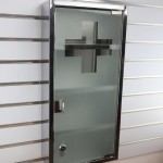 Frosted hinge door with locking mechanism and clear medical cross symbol